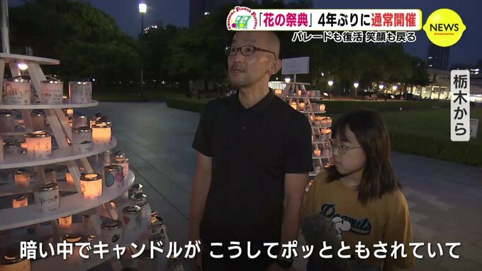 夜、平和公園ではライトアップイベントも…。原爆慰霊碑に向かう道に並んだキャンドルに火が灯り、公園内には昼間とは違った空気が流れました。