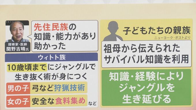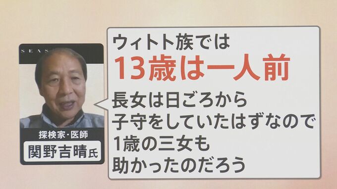 さらに探検家で医師の関野さんは「ウィトト族では13歳は一人前。長女は日ごろから子守をしていたはずなので、1歳の三女も助かったのだろう」と言います。