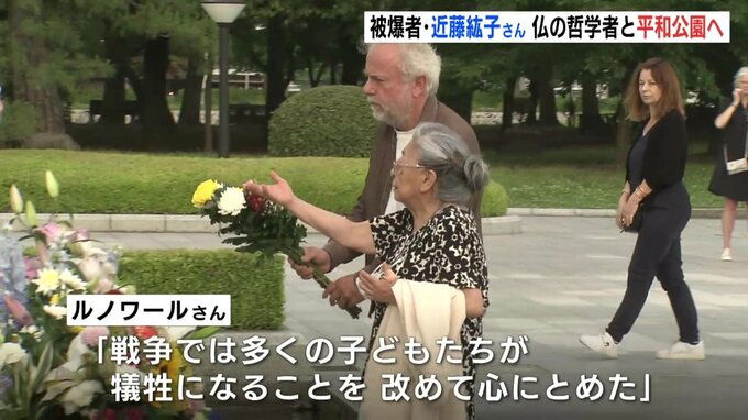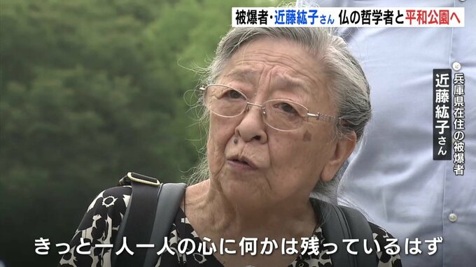 兵庫県に住む近藤紘子さんは、平和活動に尽力した牧師・谷本清さんの長女で、生後8か月で被爆しました。12日、フランス人哲学者のフレデリック・ルノワールさんとともに平和公園を訪れました。