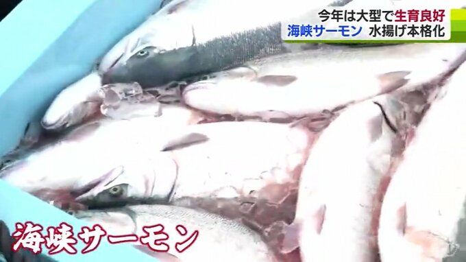 津軽海峡で育てられ「海峡サーモン」のブランド名で販売されているニジマスの水揚げが青森県むつ市で行われています。むつ市大畑地区の漁港から約3キロの津軽海峡の沖合には地元の漁業生産組合が設置したいけすに…