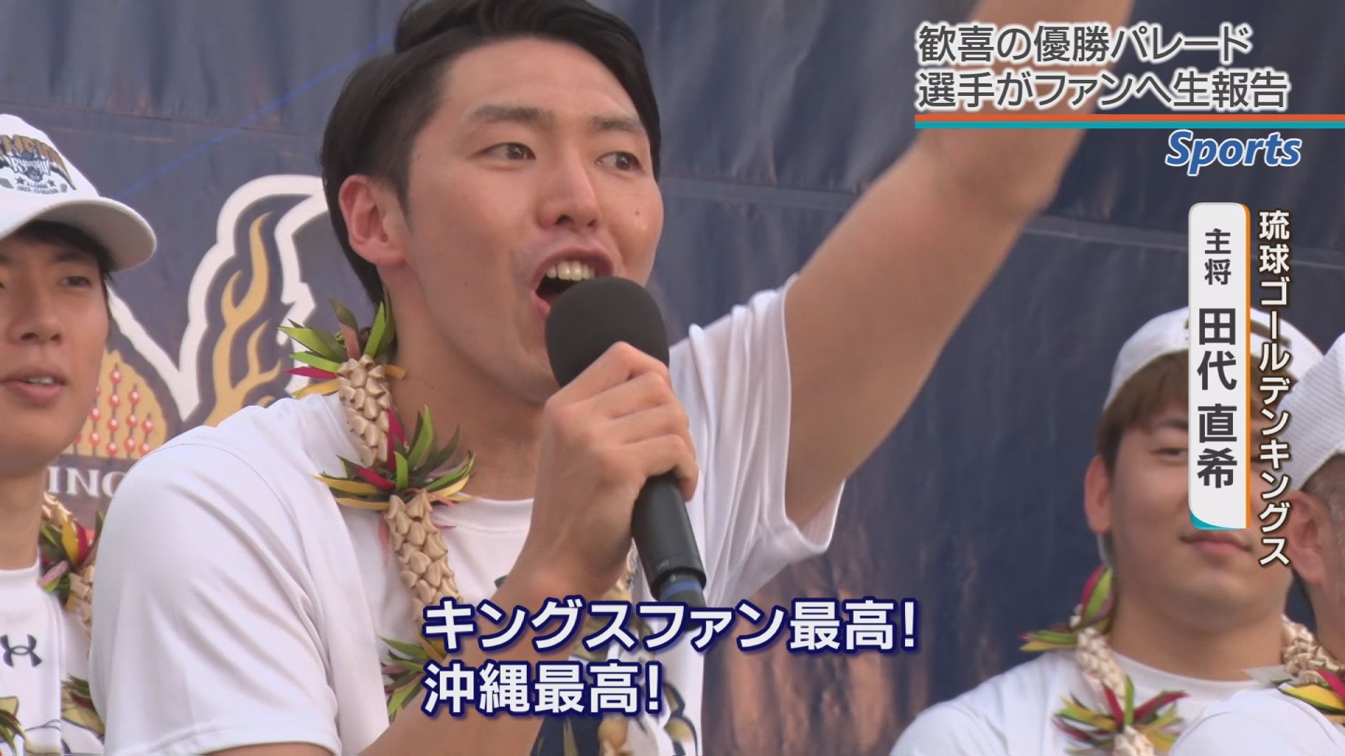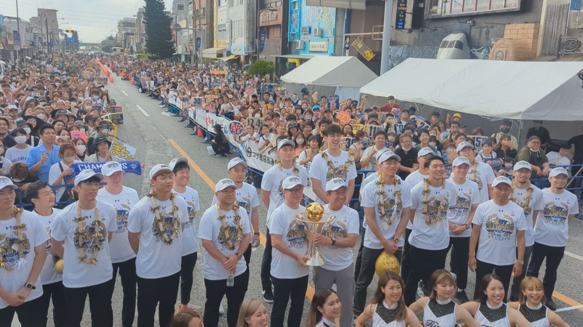 プロバスケットボールBリーグを初制覇した琉球ゴールデンキングス。本拠地のある沖縄市で優勝パレードを行いました。外国籍選手らを除く9人の選手と桶谷HCが凱旋。2万人を超えるファンとともに、喜びを分かち合いました。