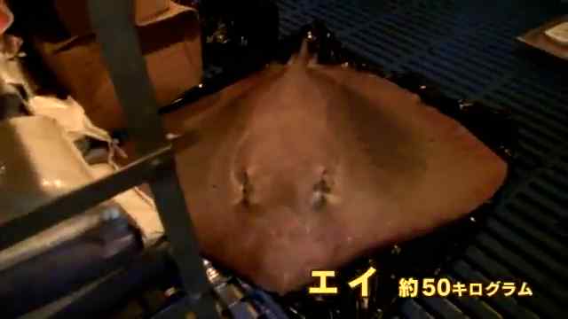 同乗取材の中で、ちょっと驚いたのがこちら・・・エイだ。重さは約50キロ。フィリピン人乗組員が甲板から垂らした釣り糸にかかり、格闘すること30分あまり。3人がかりでようやく釣り上げた。