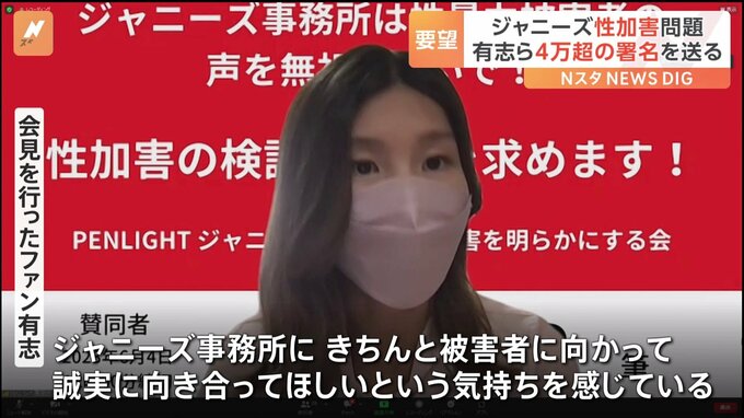 ジャニー喜多川氏からの性被害を複数の元所属タレントが訴えている問題で、ファンの有志らで作る団体が会見を開き、検証などを求める4万人分の署名を事務所側に送ったことを明らかにしました。ジャニー喜多川氏か…