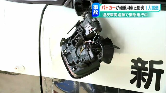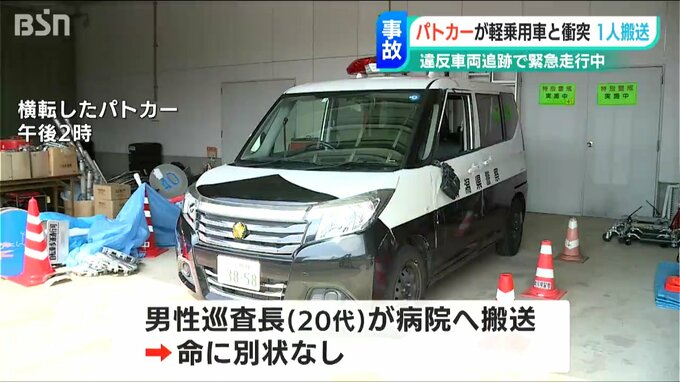 パトカーを運転していた20代の男性巡査長が頭を打って病院へ運ばれましたが、命に別状はないということです。パトカーの助手席に乗っていた40代の男性巡査部長と軽乗用車を運転していた男性にけがはありませんでした。