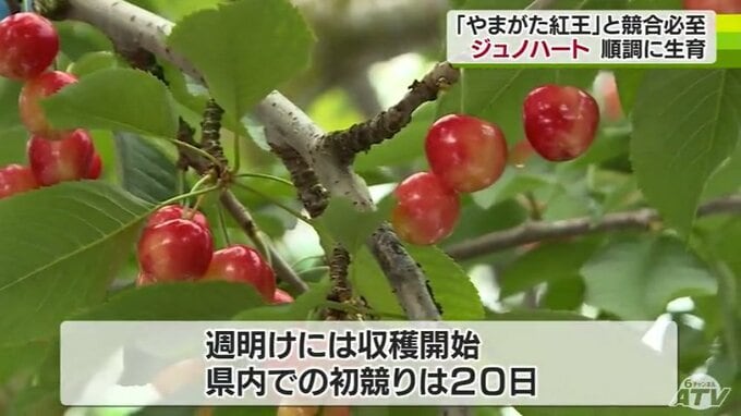 今年のジュノハートは色付きが遅いものの順調に生育していて去年並みの収穫量になる見込みです。週明けには収穫が始まり、初競りは20日を予定しています。