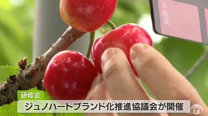 市場デビュー5年目のジュノハートは果実がハート形で500円玉より大きく、甘味が強いのが特徴です。県の担当者は出荷する際の規格をそろえるため収穫する際の実の色やサイズなどを説明しました。