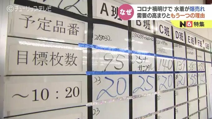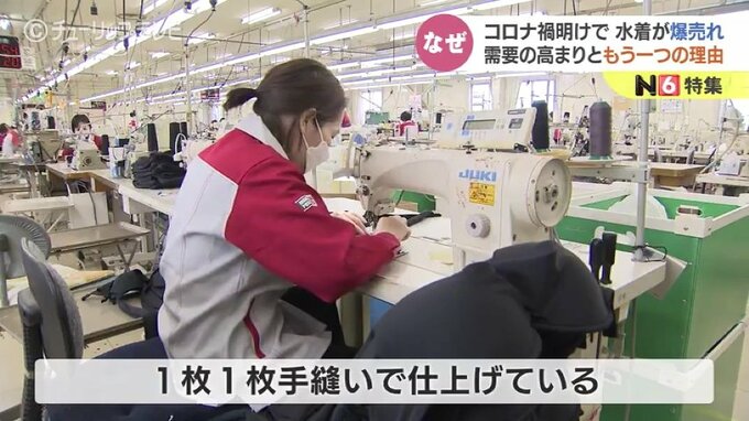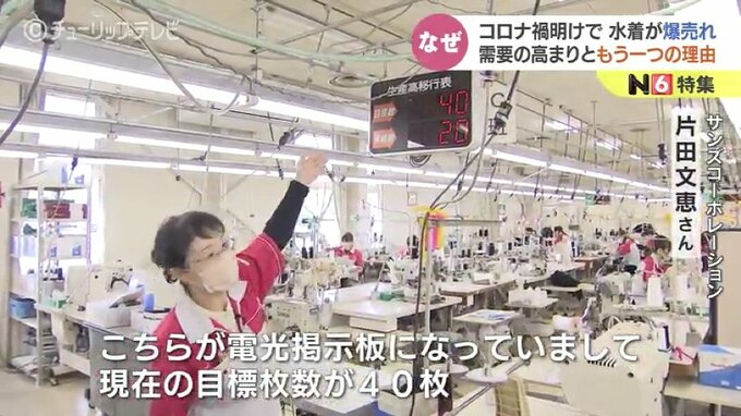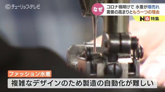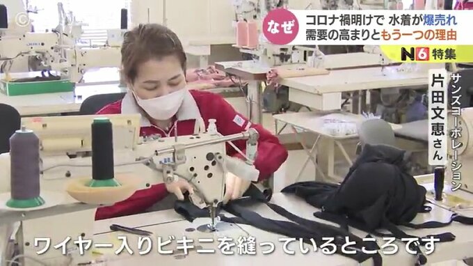 サンズコーポレーション 片田文恵さん:「ワイヤー入りビキニを縫っているところです」「厚みがあったりとか、特殊ミシンを使っているというところで、どうしても技術、テクニックが必要、ということがあります」