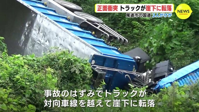13日午前、広島・尾道市の国道で軽乗用車と正面衝突したトラックが、がけ下に転落しました。