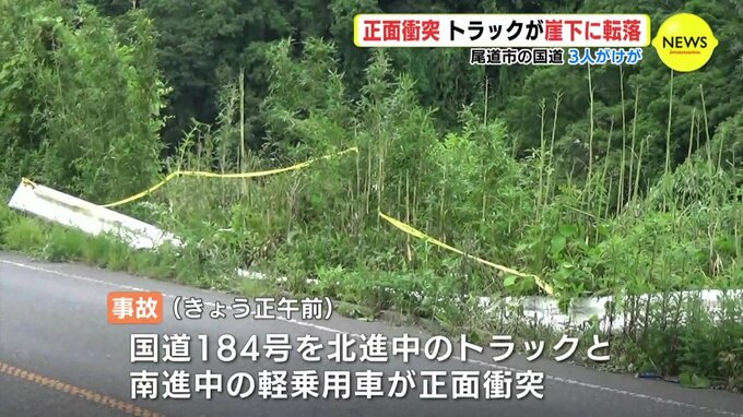 事故があったのは、尾道市 木ノ庄町の国道184号です。警察によりますと、正午前、北に向かって走っていたトラックと、対向車線を走っていた軽乗用車が正面衝突しました。 事故のはずみで、トラックが対向車線を超えて、がけ下に転落しました。