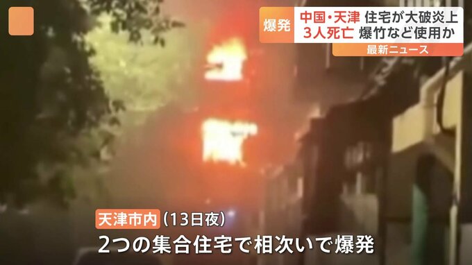 壁が崩れ、窓ガラスが吹き飛んだ建物。中からは炎が上がり、周辺の道は、がれきで埋め尽くされています。13日夜、中国・天津市内にある2つの集合住宅で相次いで爆発が起き、地元警察によりますと、これまでに3人の…