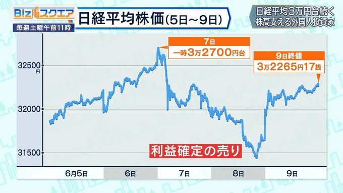 6月5日の週は、日経平均株価はバブル崩壊後の最高値を連続で更新。一時3万2700円台をつけた。週後半にかけては利益確定の売りの動きが出たが、9日の終値は3万2000円台を回復。5月17日から18日間3万円台を割っていない。