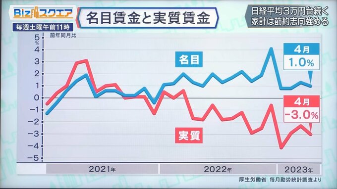 4月の毎月勤労統計によると、現金給与の総額に当たる名目賃金は1.0%のプラスだったが、物価の変動を反映した実質賃金は3.0%のマイナスで、13か月連続の減少となっている。