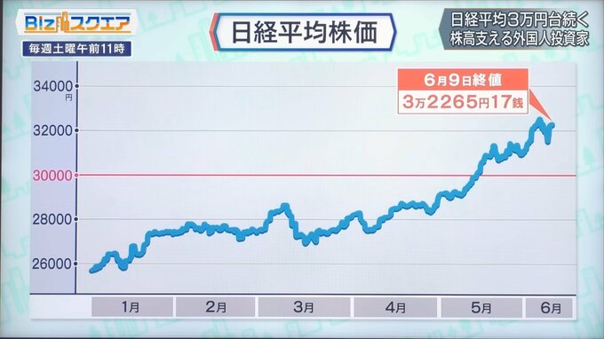 6月7日、日経平均株価は再びバブル崩壊後の最高値を更新した。3万円台を18日続けている。