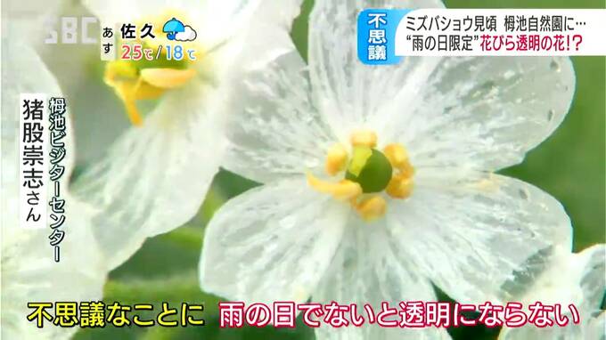 ■栂池ビジターセンター 猪股崇志(いのまた・たかし)さん 「不思議なことに雨の日でないと透明にならない。持っている水筒の水とか霧吹きでかけても全く透明にならない。こういう雨上がりとかのわずかな時間しか見れない貴重なサンカヨウです」