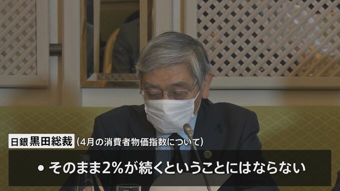 日銀の黒田総裁は今回の物価上昇について「エネルギーなどの輸入物価を背景にしたもので安定的な2%達成にはならない」としたうえで、「現在の金融緩和を粘り強く続けていくことによって経済の回復をしっかりサポートして、賃金、物価が緩やかに上昇していく姿を期待している」と述べ、引き続き金融緩和を継続していくと強調しました。
