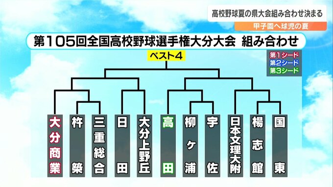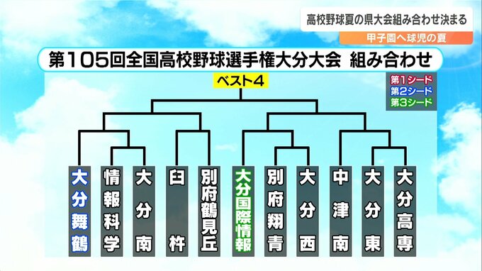 県内で初の夏3連覇を目指す第1シードの明豊。初戦の相手は、開幕試合の大分豊府と竹田の勝者です。好投手を擁する第3シードの藤蔭をはじめ、佐伯鶴城や鶴崎工業が入る激戦パートになりました。