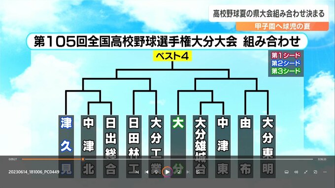 この1年間の公式戦の成績で選ばれた今大会のシード校は、第1シードが大分商業と明豊、第2シードは大分舞鶴と津久見、第3シードは藤蔭、高田、大分、大分国際情報です。