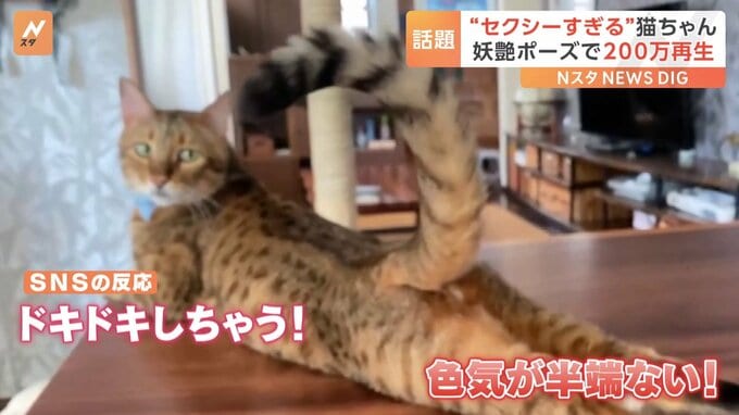 SNSで200万回再生超!「普段から脚長自慢する」ネコの“妖艶すぎるポーズ”が話題です。
