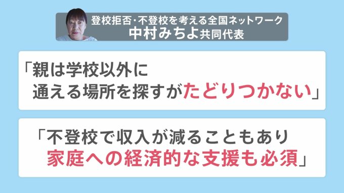 「親は学校以外に通える場所を探すがたどりつかない」「不登校で収入が減ることもあり、家庭への経済的な支援も必須」だというふうに話していました。