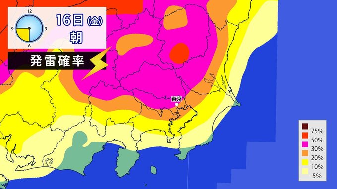 西日本や北日本では、16日にかけて大気の状態が非常に不安定となるでしょう。落雷や竜巻などの激しい突風、降ひょう、局地的な激しい雨に注意してください。※【写真】に3時間ごとの寒気の予想と発雷確率