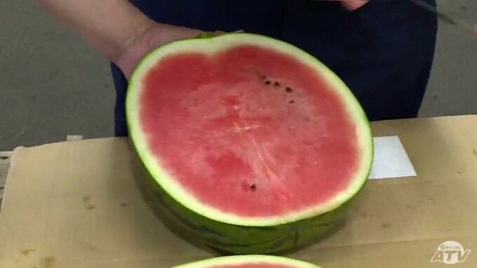 青森県つがる市のブランドスイカ=「屏風山スイカ」の初競りが行なわれ、過去最高額となる1玉15万円で競り落とされました初競りには、つがる市の野呂勝人さんのハウスで栽培された黄色い果肉の「金色羅皇」と、赤い…
