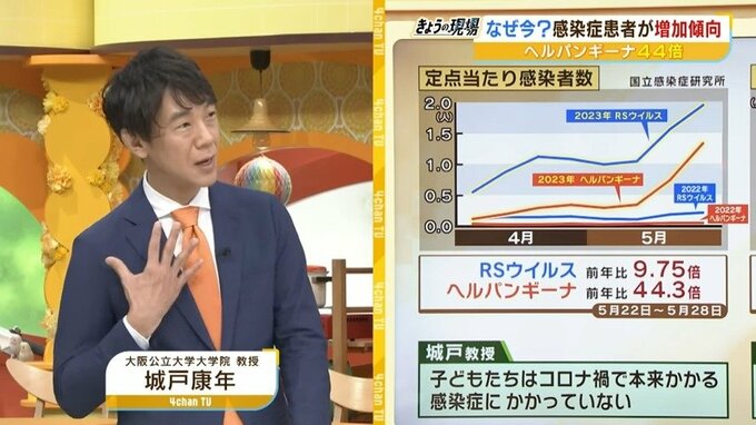 さまざまな感染症が増えています。特に今年ははしかが流行の兆し。空気感染による感染力は最強といわれ、1人が感染する人数は12人~14人。また感染するとこれまで獲得した免疫記憶が消失してしまうケースも報告されています。さらに「RSウイルス」や「ヘルパンギーナ」などの感染症が急増。大阪公立大学大学院・城戸康年教授は「新型コロナ感染爆発で抑えられていたほかの感染症が今、拡大している」と話します。