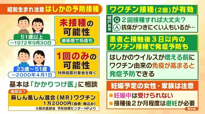 (城戸康年氏)「はしかというのは、個人的には我々が医学で使っている、子どものときからも含めて最も大切な、効果の高いワクチンだと思いますので、1回の人はぜひ2回目を打つことが、かなり有効かなと思います」