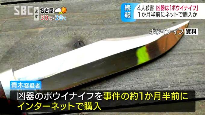 捜査関係者によりますと、青木容疑者の自宅から押収した血の付いたナイフは、刃渡り30センチほどのボウイナイフとよばれるもので、事件のおよそ1か月半前にネットで購入していたことが新たに分かりました。