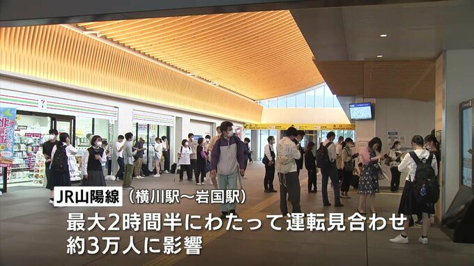 この事故のため、JR山陽線は、横川駅から岩国駅の間で最大で2時間半にわたって運転を見合わせ、およそ3万人に影響があったということです。