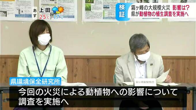 霧ヶ峰の関連団体などは15日、諏訪市で火災後初めて会合を開き、県環境保全研究所から今回の火災による動植物の植生への影響について、実態把握のため調査を行うことが報告されました。