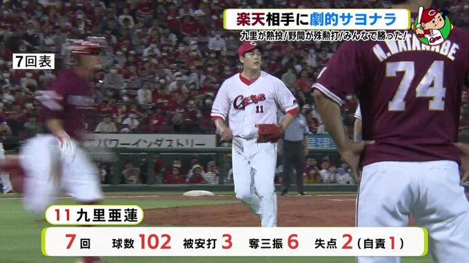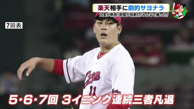カープは、その後、2対2と追いつかれますが、開幕から唯一、ローテーションを守ってきた九里はギアチェンジ。5回・6回をランナーを1人も出さずに打ち取ると、7回も3者凡退と、圧巻のピッチングで楽天打線を寄せ付けません。