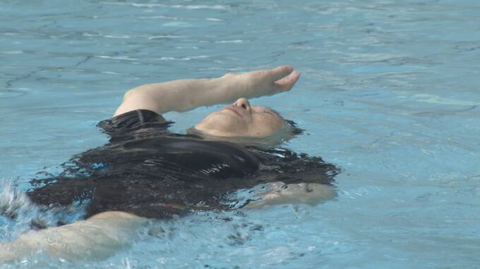 プールで練習をする有田迪子(ありた みちこ)さん、84歳。8月のマスターズ水泳の80歳から84歳の背泳ぎに出場します。