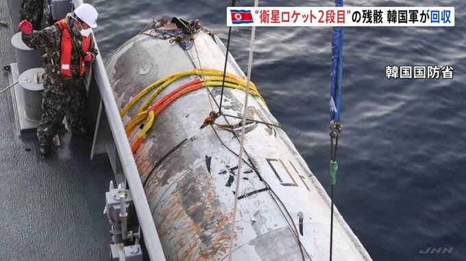 北朝鮮が先月打ち上げに失敗した「軍事偵察衛星」について、韓国軍はきのう、打ち上げに使われたロケットの2段目とみられる残骸を黄海で引き揚げました。引き揚げられた長さおよそ12メートル、直径2メートルあまり…