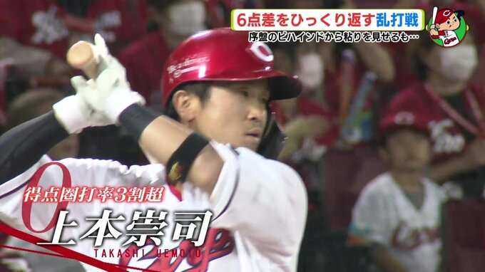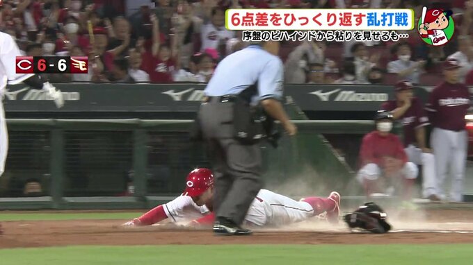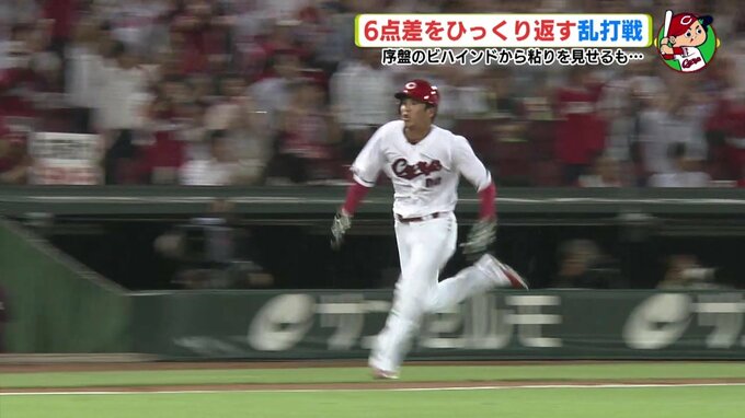 こうなると、カープの反撃は止まりません。6回には、この試合3度目の満塁のチャンスで菊池。「後ろに必死につなぐ気持ちでいった」とタイムリーヒット。大歓声の中、これで試合を振り出しへと戻しました。