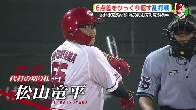 序盤で6点のリードを許す苦しい展開の中、球場の空気を変えたのは、頼れるベテランでした。4回、満塁のチャンスで新井監督が代打に送ったのは、切り札・松山竜平 。その2球目でした。代打打率4割、得点圏打率3割超え、データ通りの勝負強さを発揮し、2点を返します。