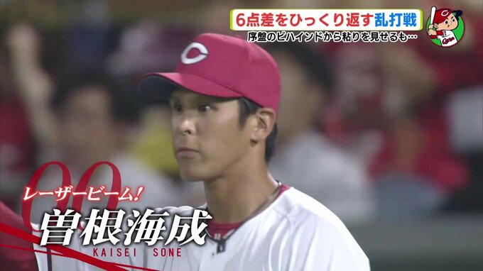 待望のリードを奪ったカープでしたが、その裏には一転、ノーアウト・3塁・1塁のピンチ。犠牲フライで同点になるかと思いきや、ライトの曽根からレーザービーム返球。勝ち越しのホームを踏んだ曽根が、ここでは守備でチームを救います。