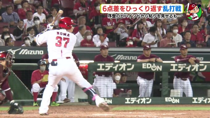 1アウト・ランナー3塁・2塁とチャンスは続き、打順は1番に返って 菊池涼介 。ショートゴロに終わるも、この間にさらに1点を加えて、球場も反撃ムードが高まります。