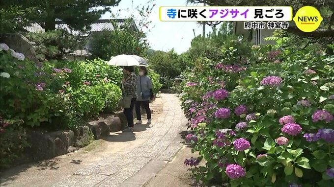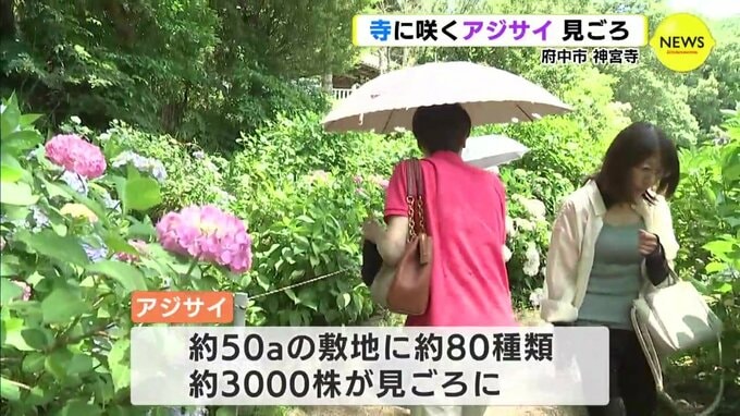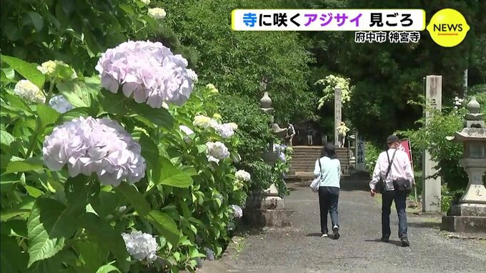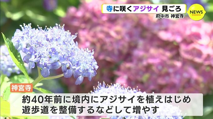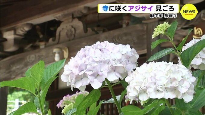 府中市にある神宮寺は、「あじさい寺」として知られていて、見ごろとなったアジサイが境内を彩っています。