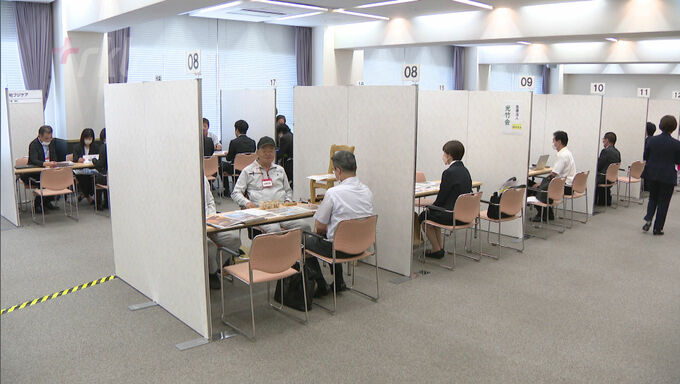福岡市天神で開かれた会社説明会には、介護福祉・建設・運輸など6つの業種から約20社が参加しました。人手不足が深刻な業界に正社員として就職を希望する人を支援しようと県が主催したもので、各ブースでは仕事内容や待遇について説明が行われました。