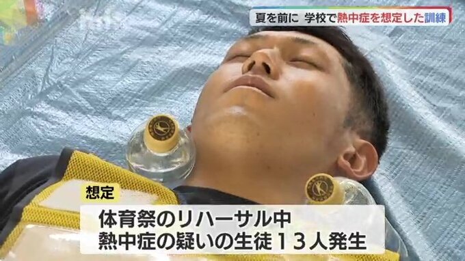 中学校のグラウンドで体育祭のリハーサル中に、熱中症の疑いがある生徒が13人発生した想定です。生徒役の消防職員が保健室に集められると、教職員らは声をかけながら、体を冷やしたり、うちわであおいだりして応急処置にあたりました。