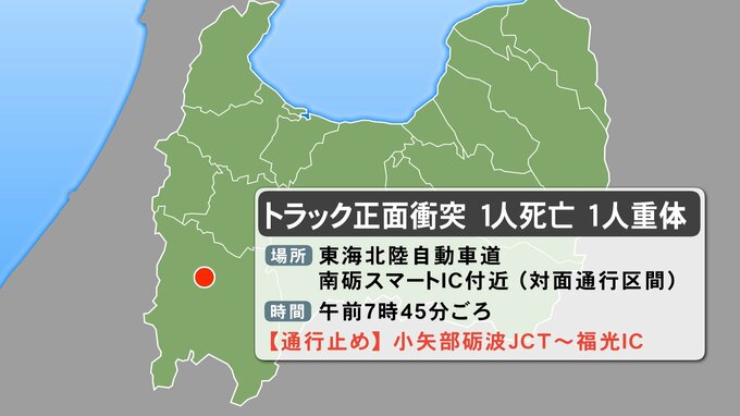18日朝、東海北陸自動車道の南砺スマートインターチェンジ付近でトラック同士が正面衝突する事故があり、運転手1人が死亡、もう1人の意識不明の重体となっています。