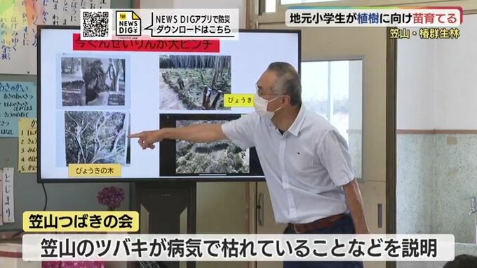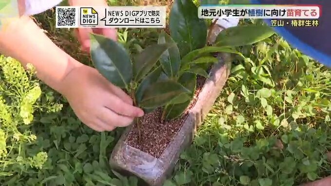 地元の小学生がツバキの苗を育て、数年後、笠山などに植樹する取り組みを始めました。