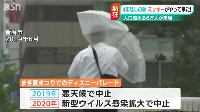 悪天候で中止になった後、新型コロナウイルス禍で間近に見ることも叶わず、地元の人が待ちに待ったミッキーマウスの登場に、西蒲区の人口を上回るおよそ6万人が集まりました。