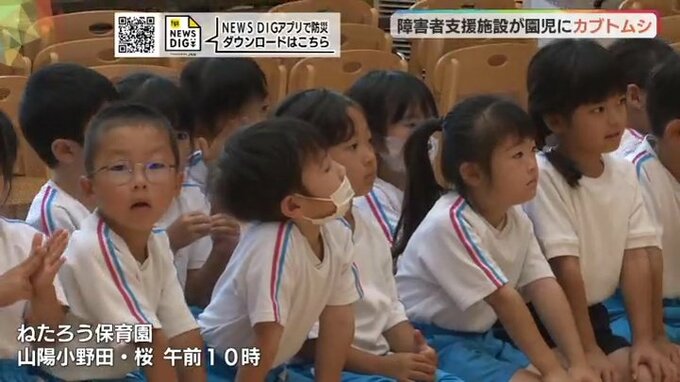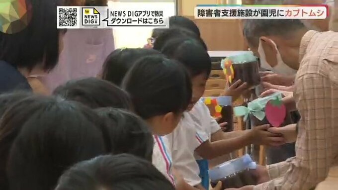 カブトムシを贈ったのは、山陽小野田市の障害者支援施設「みつば園」で市内の「ねたろう保育園」の園児にカブトムシのさなぎ10匹を手渡しました。