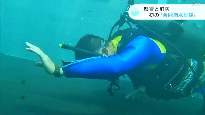 水深5mのプールに、潜っているのは、高知市東消防署の救助係と高知県警の機動隊員たち。ゴーグルの中で目隠しをして潜る、「無視界潜水」という潜水訓練です。この訓練は水難事故や災害時の現場で共に救助活動を行うことも多いことから、連携を深める目的で初めて行われ、あわせて11人が参加しました。