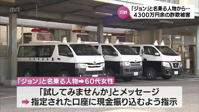 詐欺の被害です。宮崎市に住む60代女性が外国人男性を名乗る人物から投資を名目に4300万円余りをだまし取られる被害が発生しました。警察によりますと、先月中旬、宮崎市内に住む60代女性のスマートフォンに、外国…