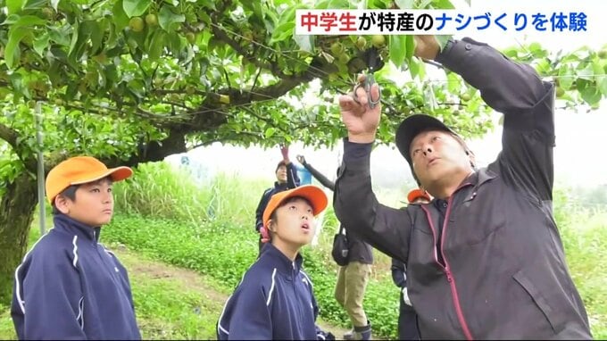 広島・三次市の中学生が、地元特産の「ナシづくり」を体験しました。三次市作木町にある「高丸農園」を訪れたのは、地元にある作木中学校の1年生です。特産品を知り、地域に誇りを持ってもらおうと、生徒たちは総…