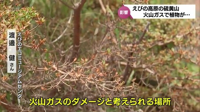 えびの高原の硫黄山についてです。現在、硫黄山付近では、基準を超える濃度の火山ガスが検出され、近くの県道が通行止めとなっていますが、影響は、周辺の植物にも及んでいるようです。えびの高原の硫黄山近くを通…