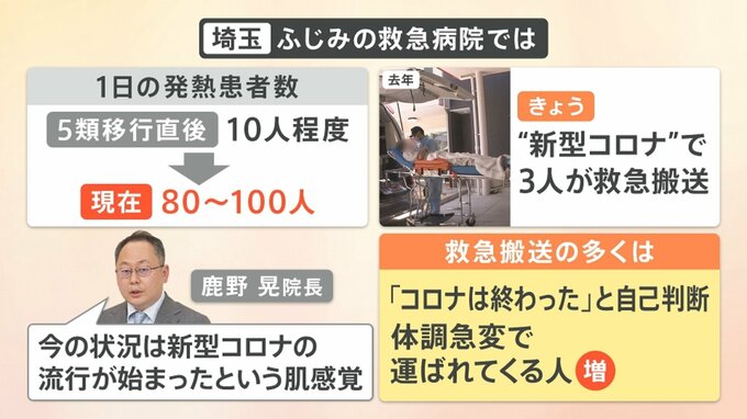 実際に現場の先生方の声も聞いてみます。埼玉・ふじみ野救急病院では、1日の発熱の患者の数は5類移行直後は10人程度でしたが、現在は80~100人とかなりの人数になっています。鹿野晃院長は「今の状況は新型コロナの流行が始まったという肌感覚」だということです。