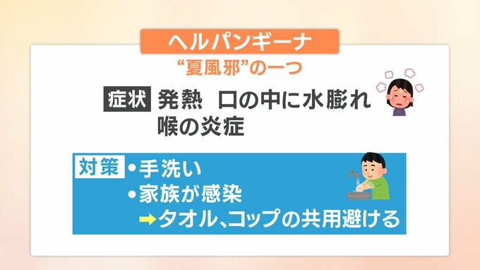 また、ヘルパンギーナはいわゆる夏風邪の1つと言われていて、発熱と同時に口の中に水ぶくれができて喉が痛むのが特徴です。感染予防には、こちらも手洗いが有効で、家族が感染した場合はタオルやコップの共用を避けましょう。